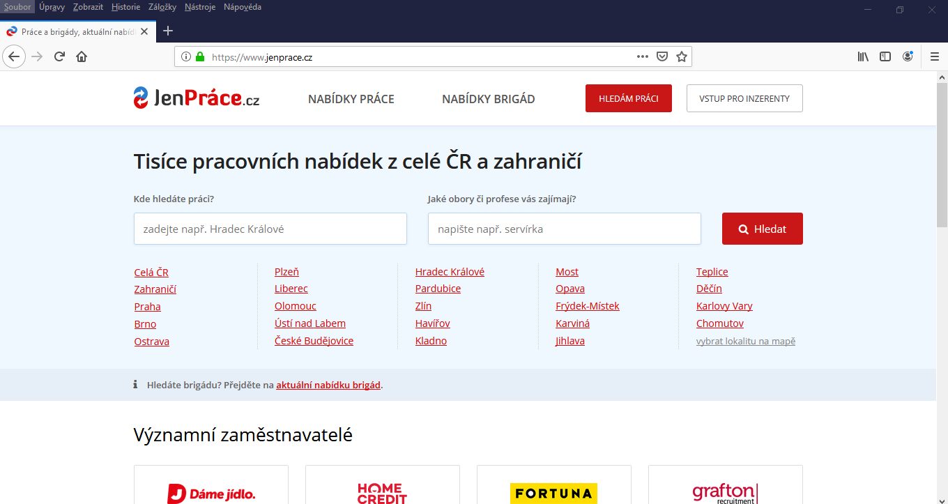 Dalším pracovním serverem je jenprace.cz. Poptávky po zaměstnancích má tento portál rozsáhlé prakticky ve všech oborech. Ovšem vizuální stránka působí celkem fádně, ačkoli je jinak členění jednotlivých položek přehledné.