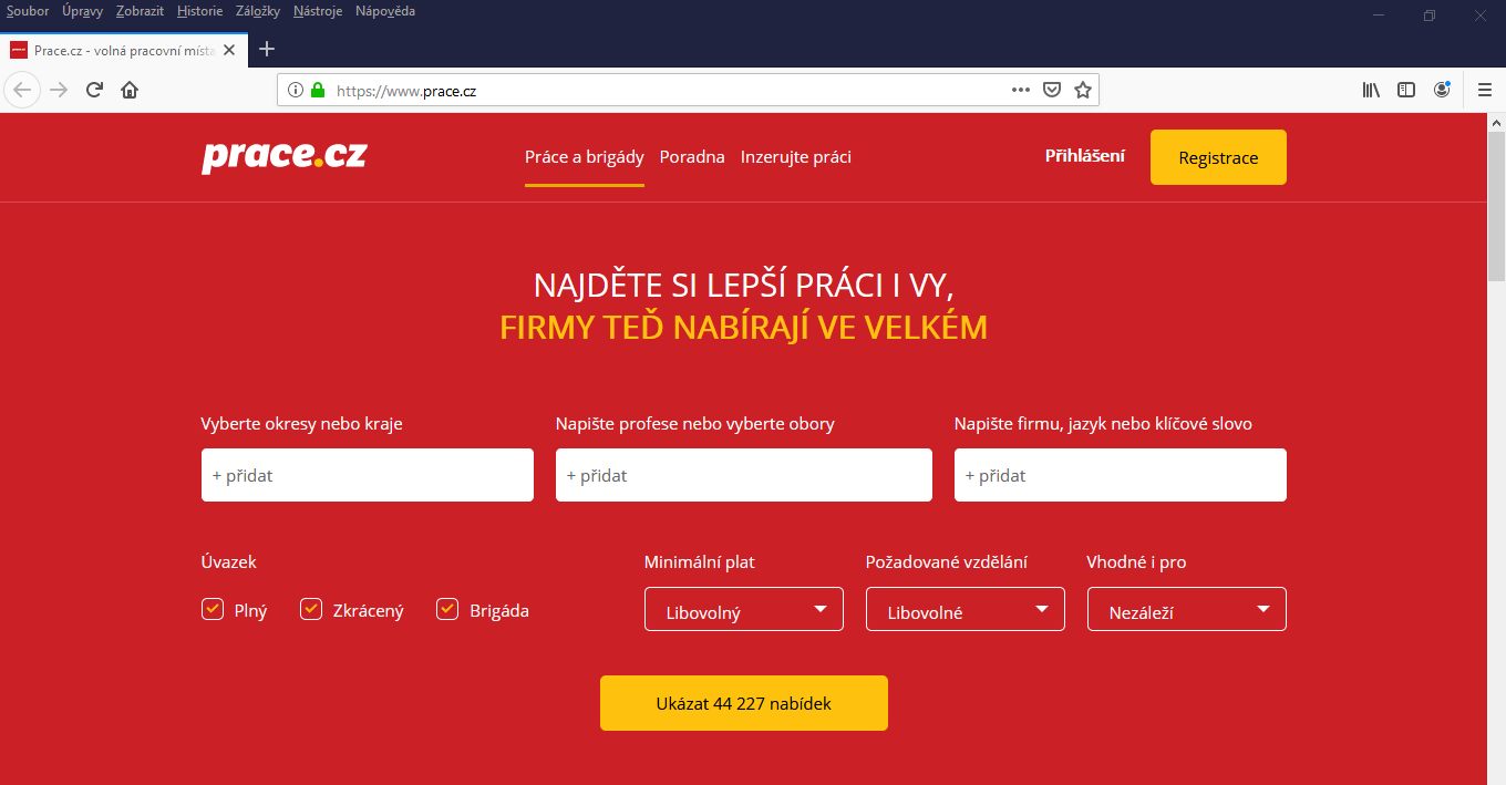 Ihned po příchodu na úvodní stránku portálu na vás vyskočí právě v tomto hledacím formuláři jednotlivá pole ke zjištění vašich kritérií na pracovní nabídky. V prvé řadě můžete vyhledávacímu systému prozradit, v jakém okresu nebo kraji práci sháníte. V případě větších měst máte možnost zvolit i některou z městských částí. U jednotlivých polí platí, že je můžete a nemusíte vyplnit, tzn. využíváte je jen, když chcete výběr inzerátů co nejvíce zúžit.