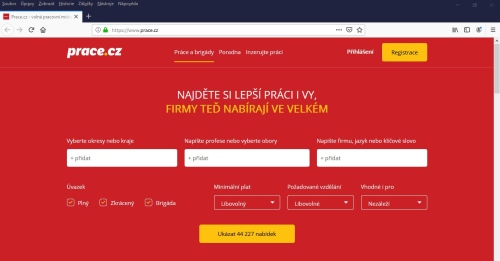 Internetový vyhledávač volných pracovních míst prace.cz je známým portálem. Za to vděčí zejména přehledné vizuální stránce a množství pracovních nabídek. Po vizuální stránce představuje profesionáloní práci. Ne každému však musí sednout křiklavě červená, která je základní barvou hledacího formuláře a hlavního prvku úvodní strany.